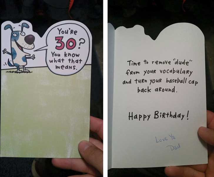 ¿Tienes 30? Ya sabes lo que eso significa. Es tiempo de dejar de decir “compadre” y ponerte tu gorra de béisbol. Te amo, papá.